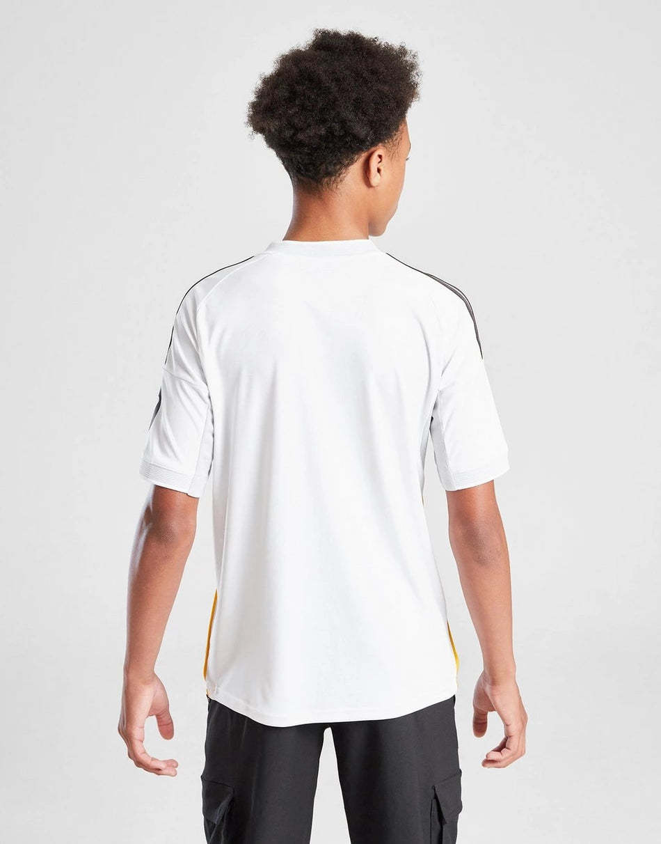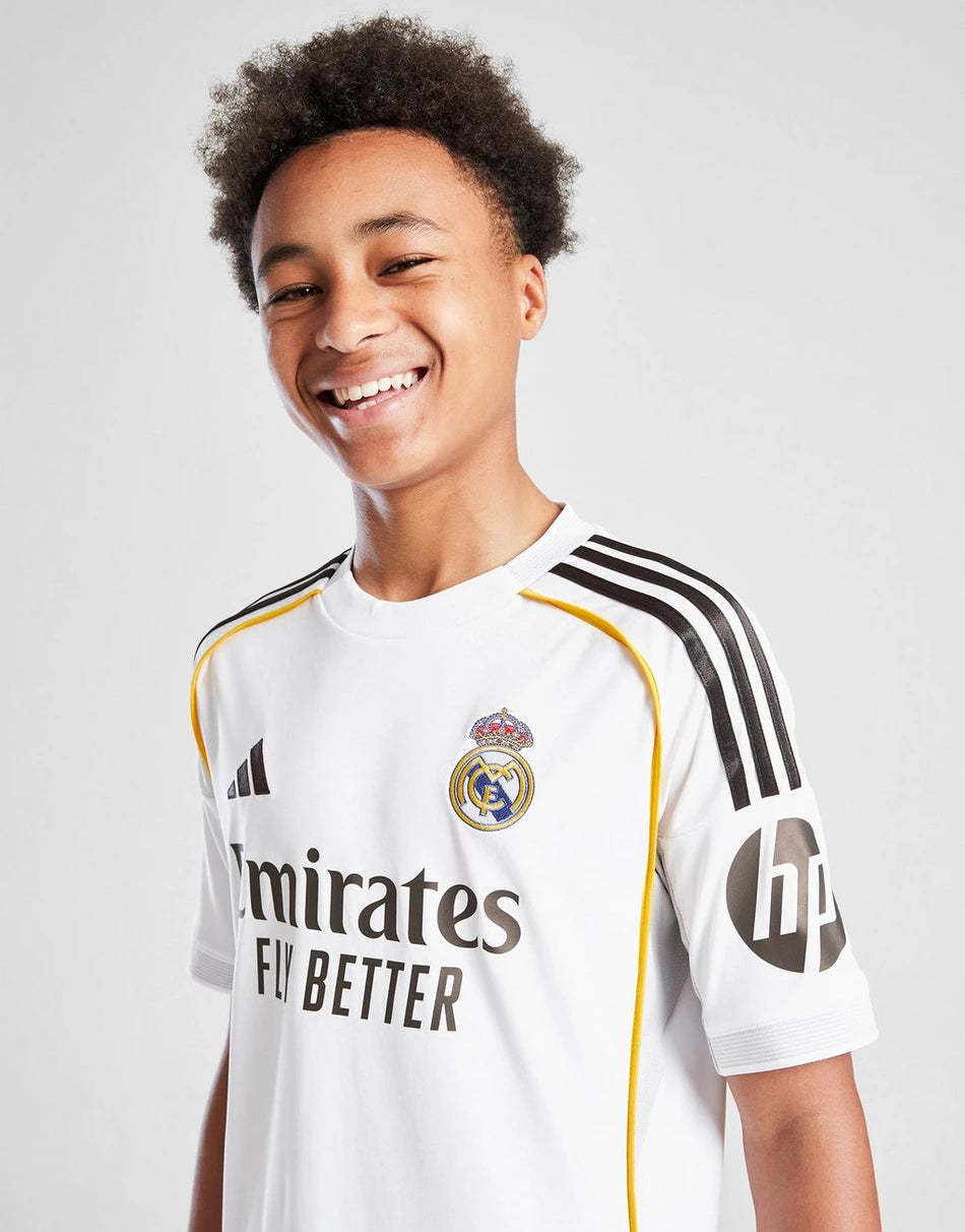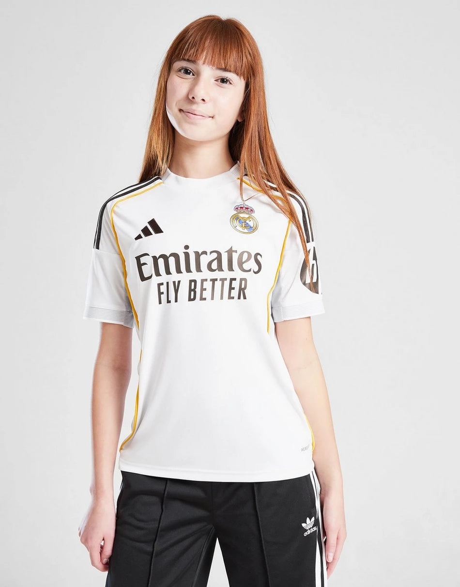 The Adidas Real Madrid 2025/26 Home Shirt for juniors combines classic elegance with modern performance. Crafted from lightweight, breathable fabric, it ensures comfort for young fans on and off the pitch. Featuring the iconic white design and the legendary Real Madrid crest, it symbolizes pride and excellence. A must-have for every young Los Blancos supporter.