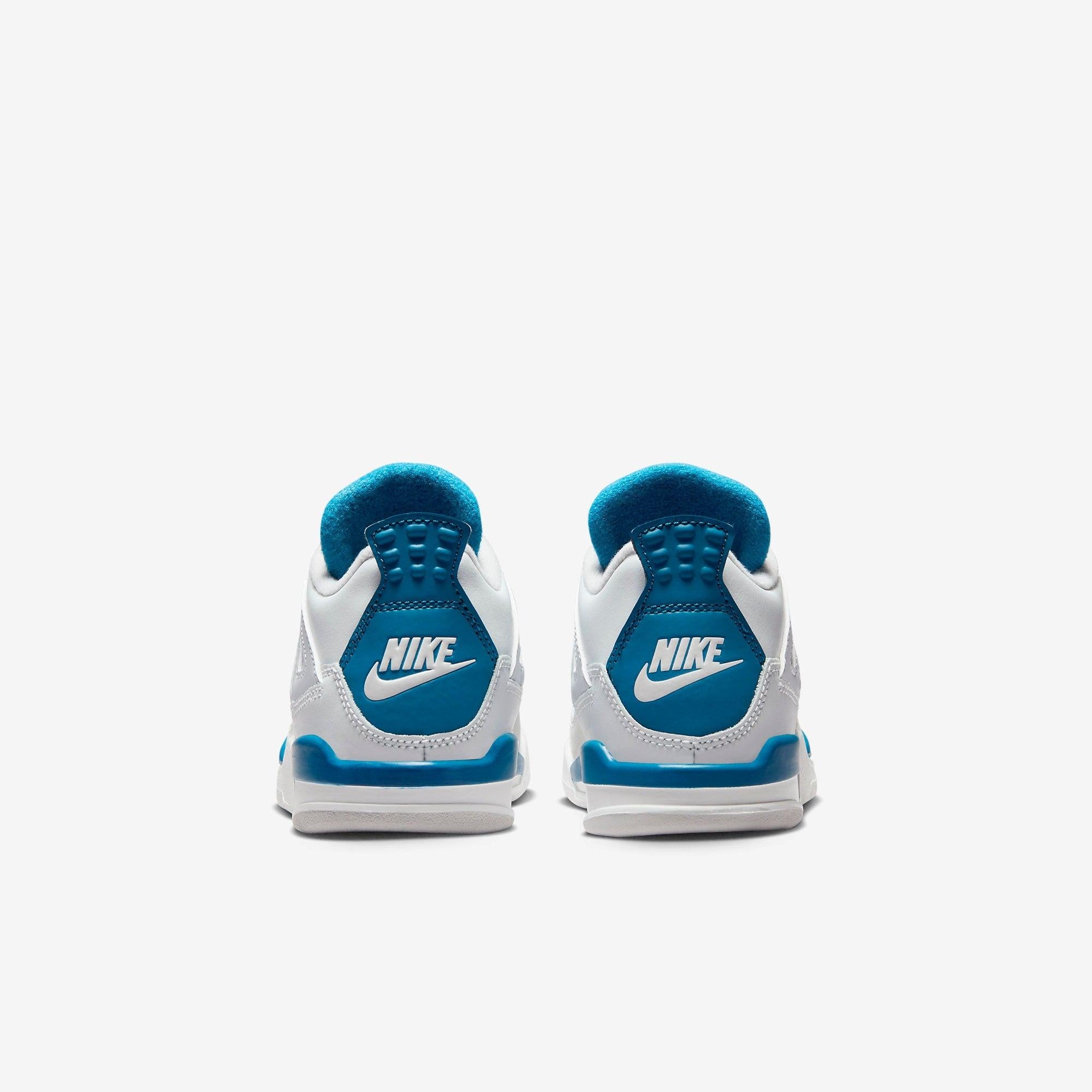 Embrace a classic with the AJ4, featuring premium Off-White leather, Neutral Grey nubuck, and bold Industrial Blue accents for a clean aesthetic. This iconic model is reengineered to its original 1989 specifications, boasting signature elements like the Jumpman logo, netting accents, the iconic 'wings,' and Nike Air branding on the heel for a touch of heritage style.