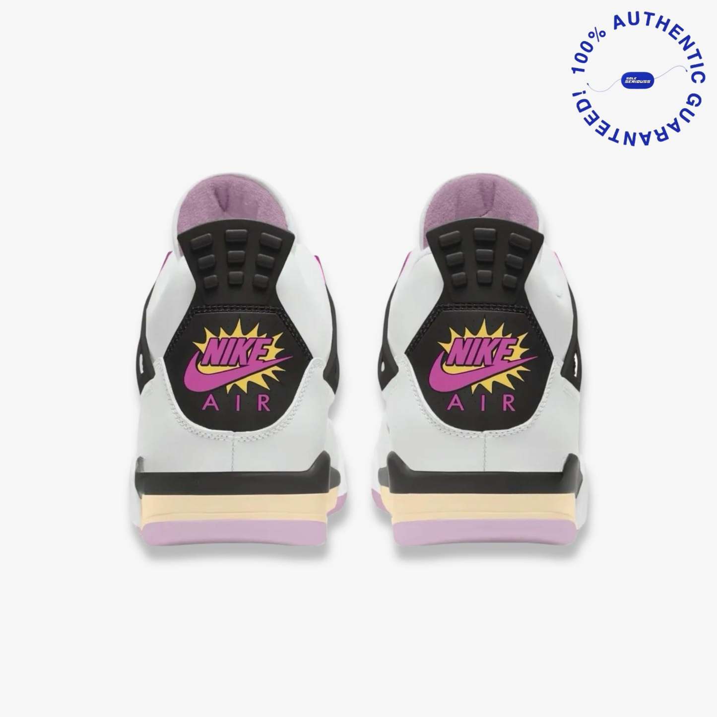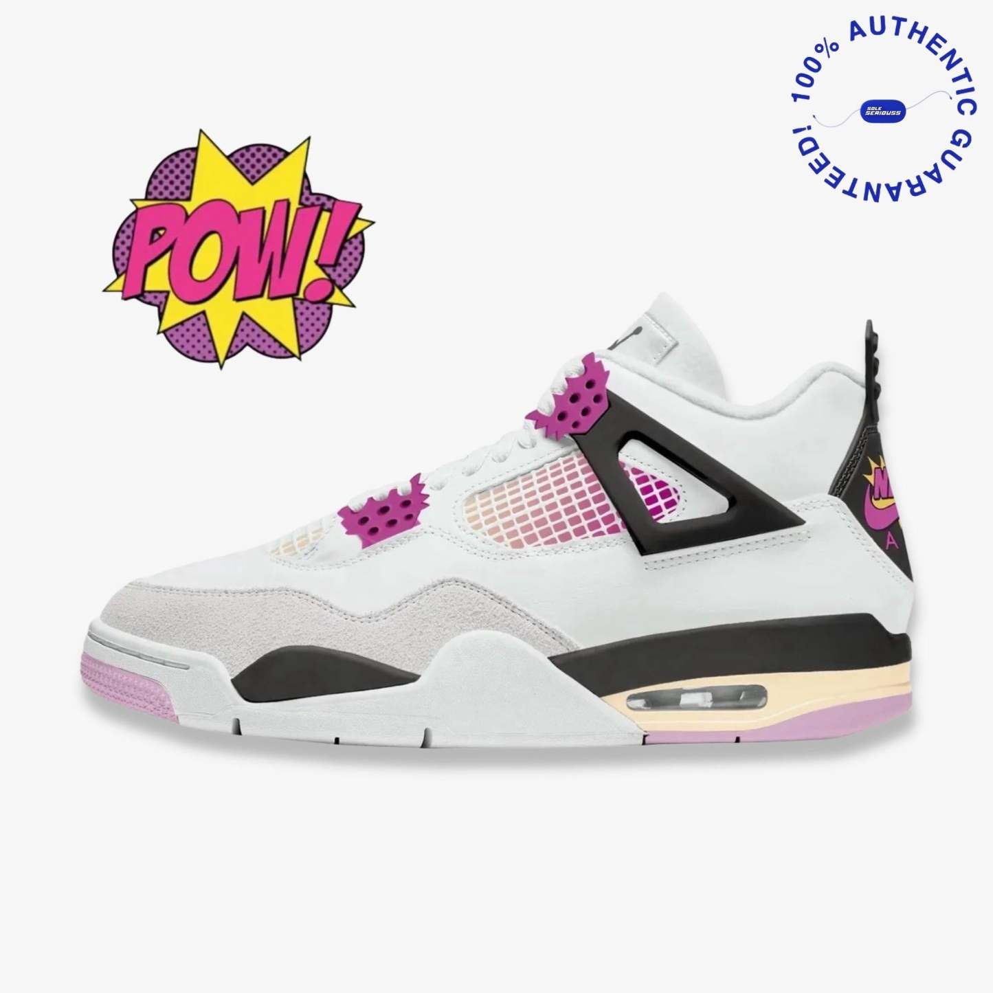 This vibrant reinterpretation of the AJ4 blends graphic pop-art inspiration with heritage design, featuring bold “POW!” wing eyelets, a comic-style burst graphic on the heel logo and a gradient mesh underlay that channels classic illustrated energy. Built on the unmistakable silhouette known for its visible Air-Sole unit and mesh side panels, it offers premium materials and iconic structural overlays repurposed in a new narrative. The playful mix of off-white, anthracite, fire pink and light arctic pink elevates the design into collector territory, while subtle aged midsole detailing delivers a vintage nod to sneaker culture.