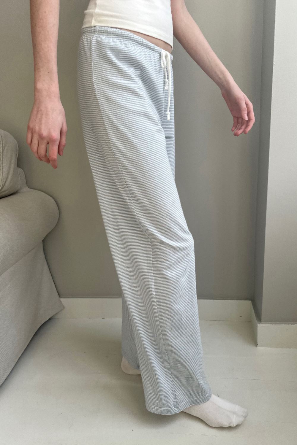 Wide leg fit pants with a drawstring waist, and side pockets.