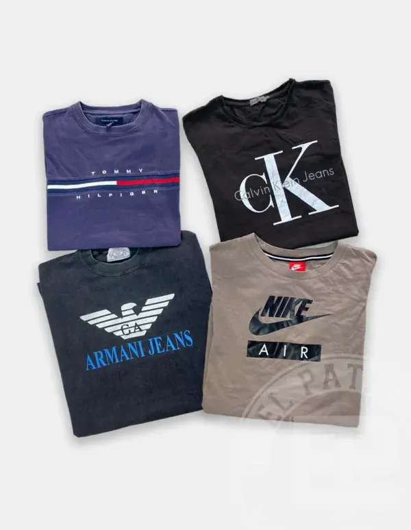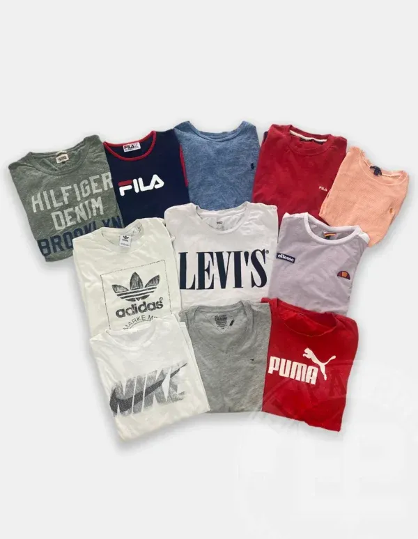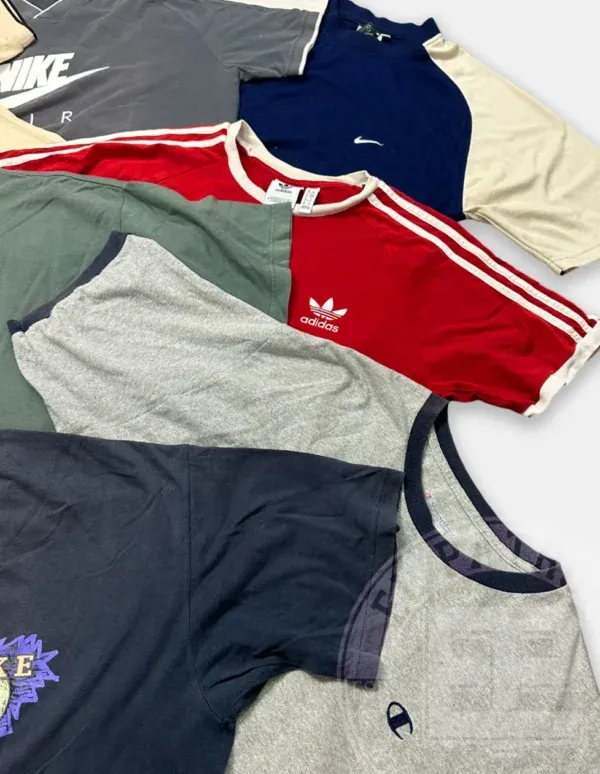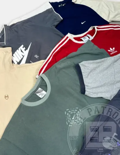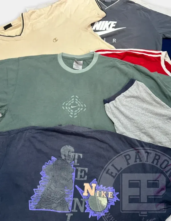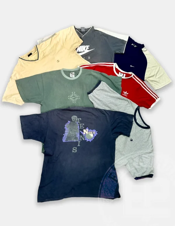 Camisetas vintage de marcas reconocidas; seleccionadas individualmente, disponibles en packs desde 10 unidades. Prendas en buen estado, con logos visibles y estilos deportivos, casuales o clásicos.