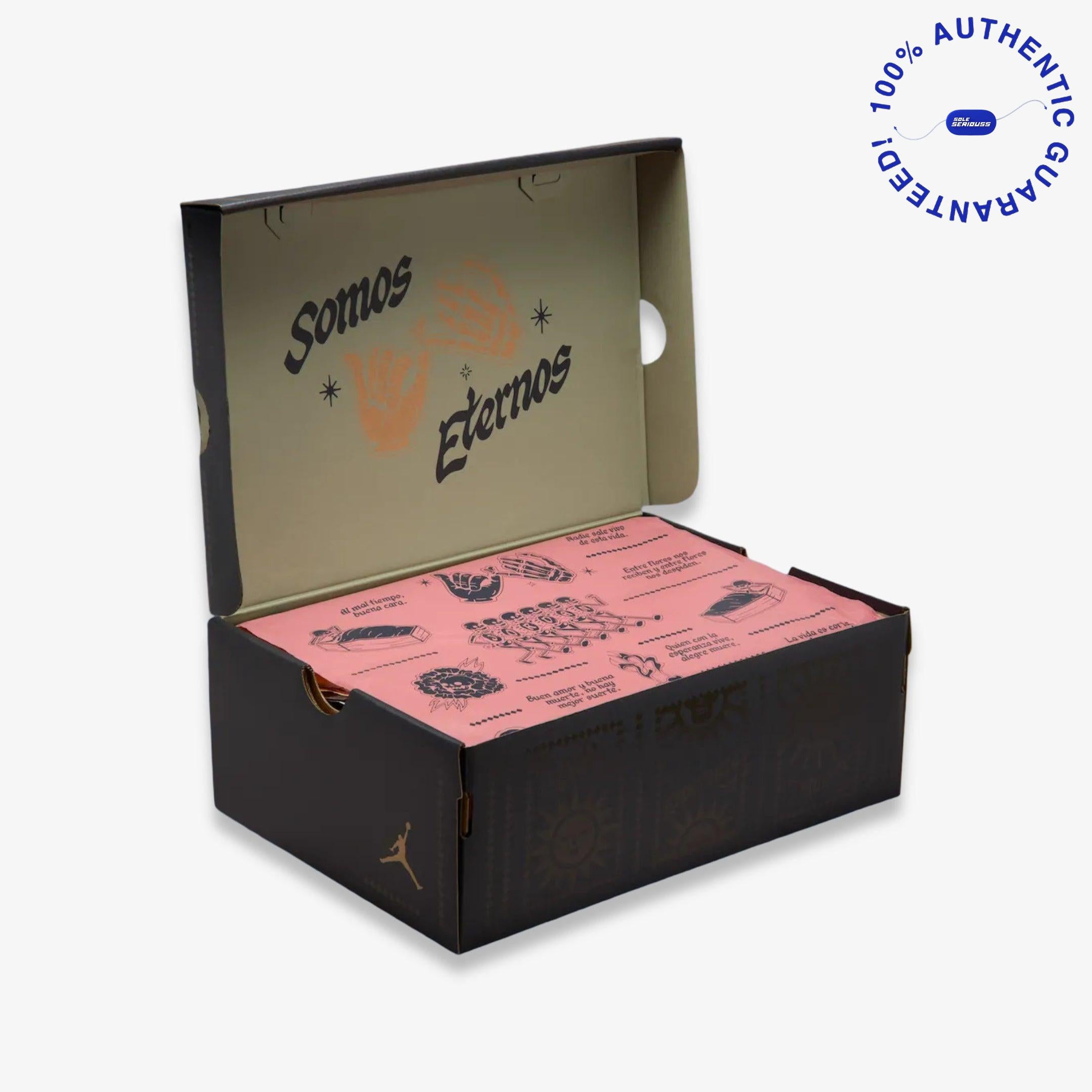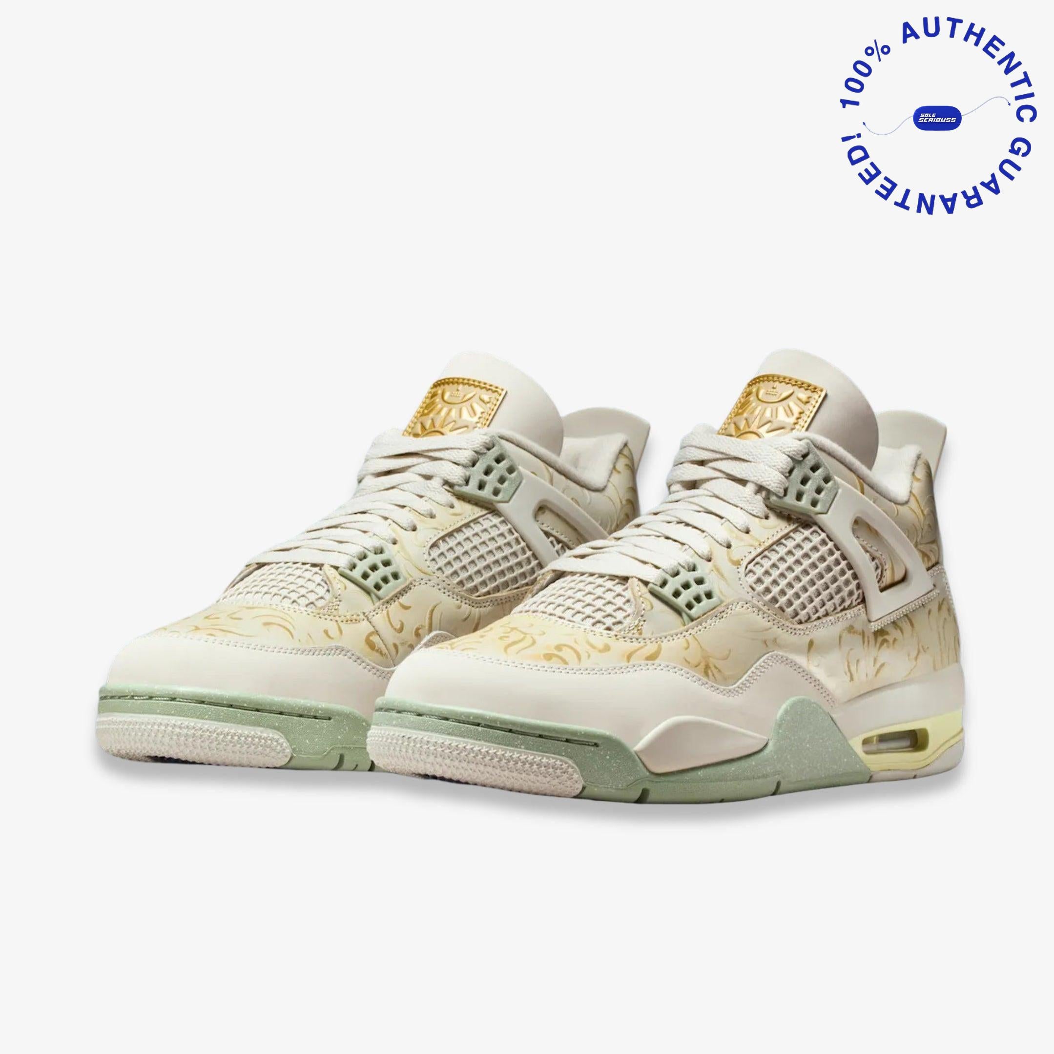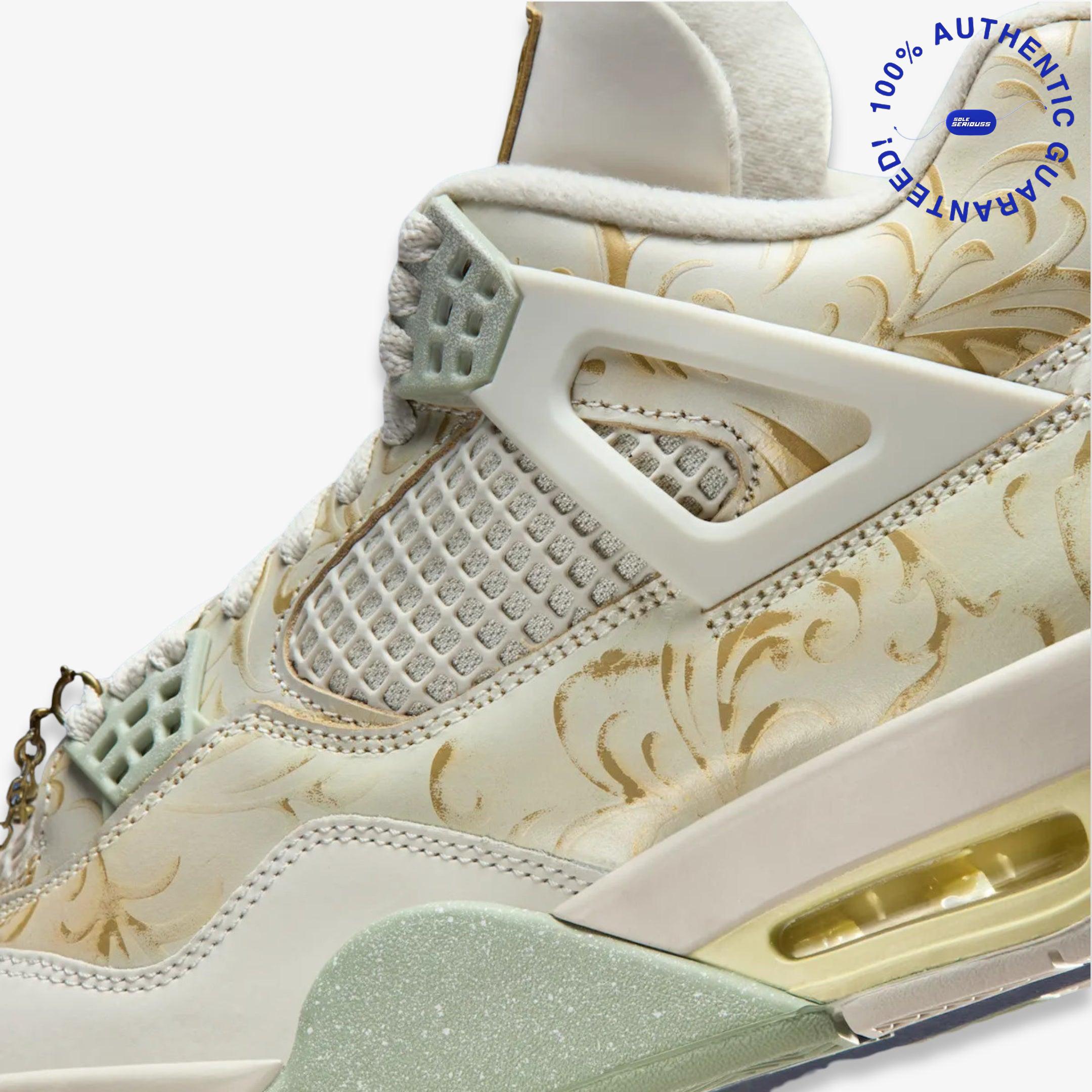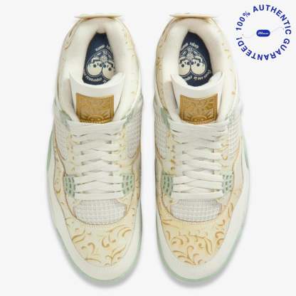 The Air Jordan 4 Retro SE “Somos Eternos” is a tribute piece from Jordan Brand’s 2025 Día de Muertos collection that blends heritage, symbolism and premium detailing. It features a Soft Pearl and Light Bone leather upper accented with Metallic Gold highlights, floral motifs, and jade-green midsole detailing, while special extras like the custom chain hang-tag and translucent outsole underscore the “We Are Eternal” ethos.