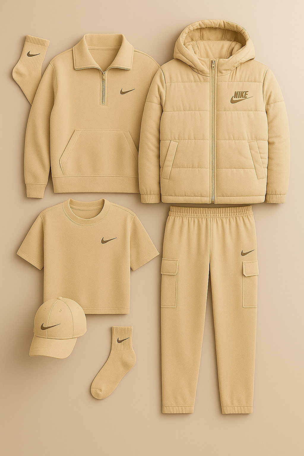 Redéfinissez l'allure urbaine avec L'Intemporel, un ensemble coordonné qui mise sur la pureté des lignes et une fonctionnalité absolue. Cet écosystème vestimentaire joue la carte du "layering" parfait : la doudoune matelassée offre une protection thermique supérieure, tandis que le duo sweat demi-zip et t-shirt assure une transition fluide entre l'extérieur et l'intérieur. Le pantalon cargo, structuré et pratique, s'associe aux accessoires pour créer une silhouette lumineuse et résolument moderne.